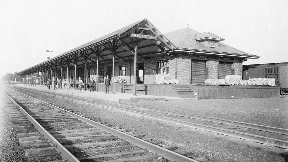 The brick station was a true combination depot, handling both passenger and freight business for N&W in Charles Town. Period photos show a low, broad-shouldered brick building under a tall hipped roof punctuated by dormer windows, with large freight doors and platform space that could serve both express and less-than-carload shipments, along with waiting rooms and office space inside.
